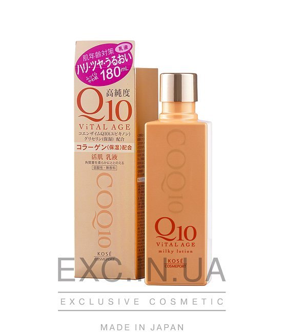 Молочко от японского бренда Kose «Vital Age Q10 Milky Lotion» предназначено для интенсивного увлажнения кожи. В состав молочка входят синтезированные коллагеновые волокна, которые мягко ухаживают за кожей, борятся со старением и имеют восстанавливающий эффект. Глицерин в составе восстанавливающего средства помогает вашей коже быть максимально увлажненной, а коэнзим Q10 защищает ее от пагубного действия свободных радикалов и дарит целебную энергию для борьбы с возрастными изменениями кожи. Экстракт коэнзима, будучи антиоксидантом, стимулирует защитные механизмы вашей кожи, предупреждая появление морщин, пигментных пятен и заломов на коже. При использовании восстанавливающего молочка ваша кожа вновь будет мягкой и увлажненной, иметь нежный блеск и станет более эластичной.