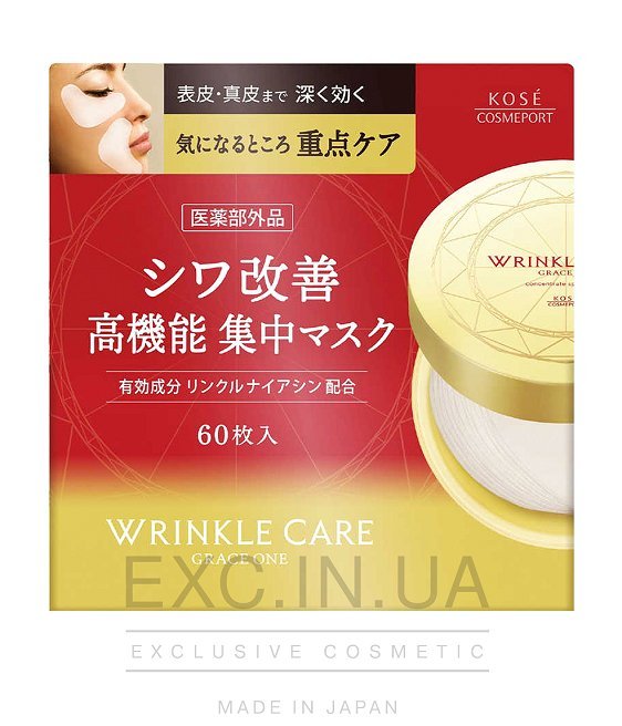 Из-за особенностей строения кожа вокруг глаз более всего подвержена стрессу и влиянию факторов внешней среды, а потому нуждается в особенном уходе. Инновационные патчи KOSE Grace One Wrinkle Care Concentrate Spots Mask подходят для ежедневного ухода за кожей вокруг глаз и губ - мест, где из-за активной мимики образуются видимые морщинки и тонкие линии.